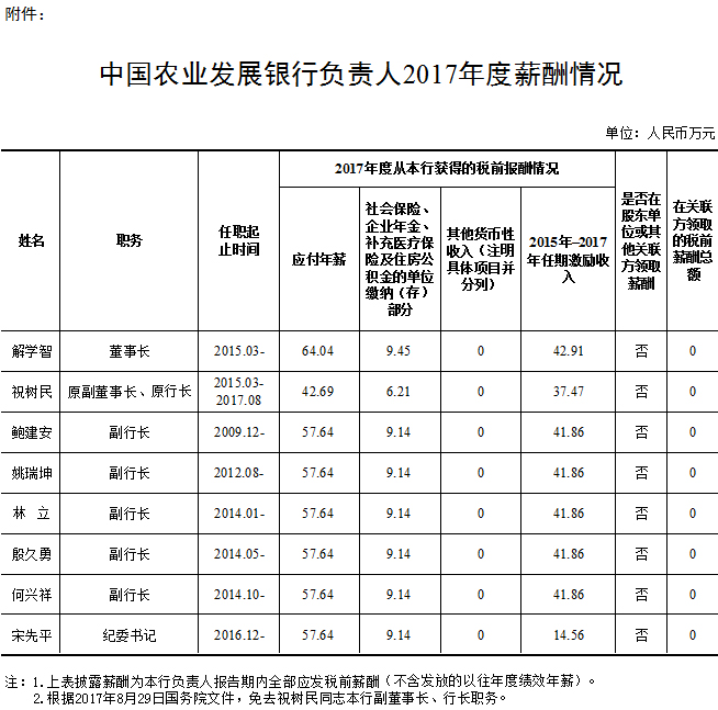 自2015年1月起,中國(guó)農(nóng)業(yè)發(fā)展銀行董事長(zhǎng)、行長(zhǎng)、紀(jì)委書記及其他副職負(fù)責(zé)人的薪酬,按照國(guó)家關(guān)于中央管理企業(yè)負(fù)責(zé)人薪酬制度改革的意見(jiàn)執(zhí)行。根據(jù)國(guó)家有關(guān)規(guī)定,現(xiàn)公開(kāi)披露中國(guó)農(nóng)業(yè)發(fā)展銀行負(fù)責(zé)人2017年度薪酬。