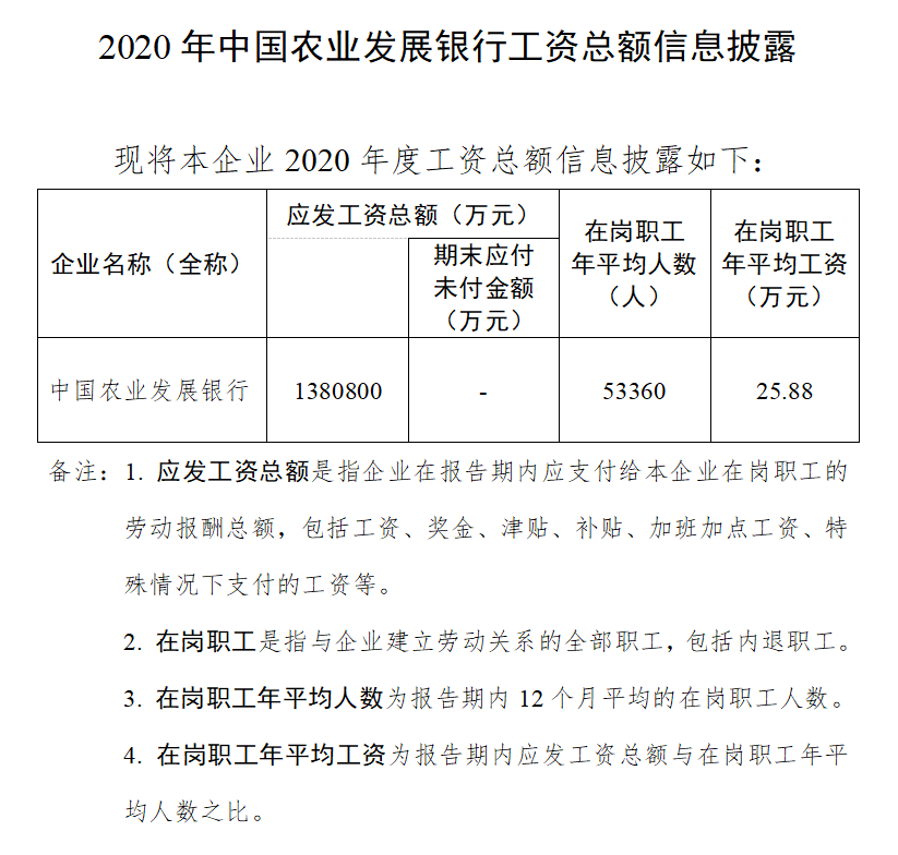 2020年中國農(nóng)業(yè)發(fā)展銀行工資總額信息披露