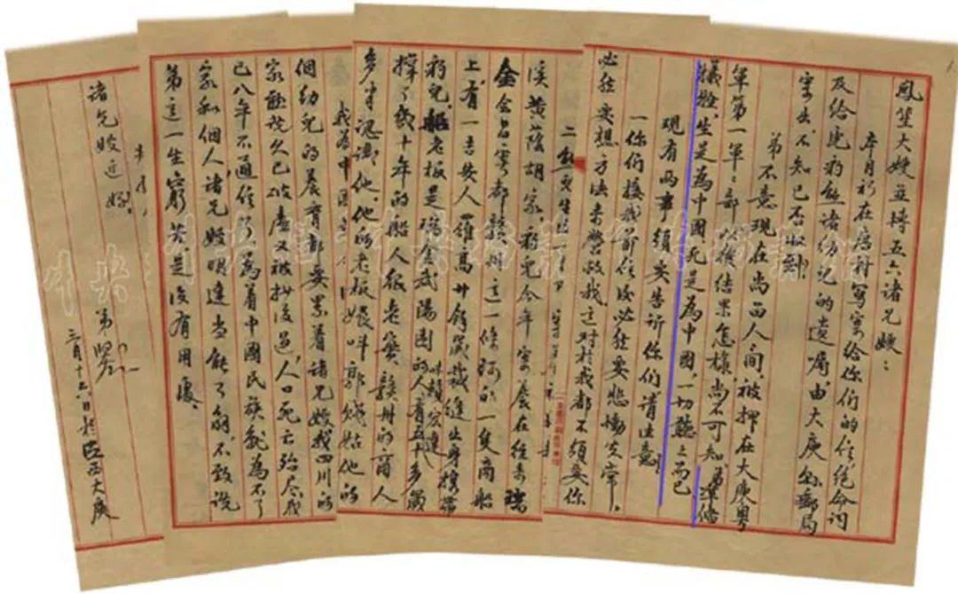 ……弟不意現(xiàn)在尚留人間,被押在大庾粵軍第一軍軍部,以后結(jié)果怎樣,尚不可知,弟準(zhǔn)備犧牲,生是為中國(guó),死是為中國(guó),一切聽(tīng)之而已。現(xiàn)有兩事須要告訴你們,請(qǐng)注意。一、你們接我前信后必然要悲慟失常,必然要想方法來(lái)營(yíng)救我……我為救中國(guó)而犯危險(xiǎn),遭損害,不需要找他們來(lái)營(yíng)救我,幫助我,使他們?yōu)殡y……二、熊兒生后一月即寄養(yǎng)福建新泉芷溪黃蔭胡家……我為中國(guó)革命沒(méi)有一文錢的私產(chǎn),把三個(gè)幼兒的養(yǎng)育費(fèi)要累著諸兄嫂……為著中國(guó)民族就為不了家和個(gè)人,諸兄嫂明達(dá),當(dāng)能了解,不致說(shuō)弟這一生窮苦,是沒(méi)有用處……