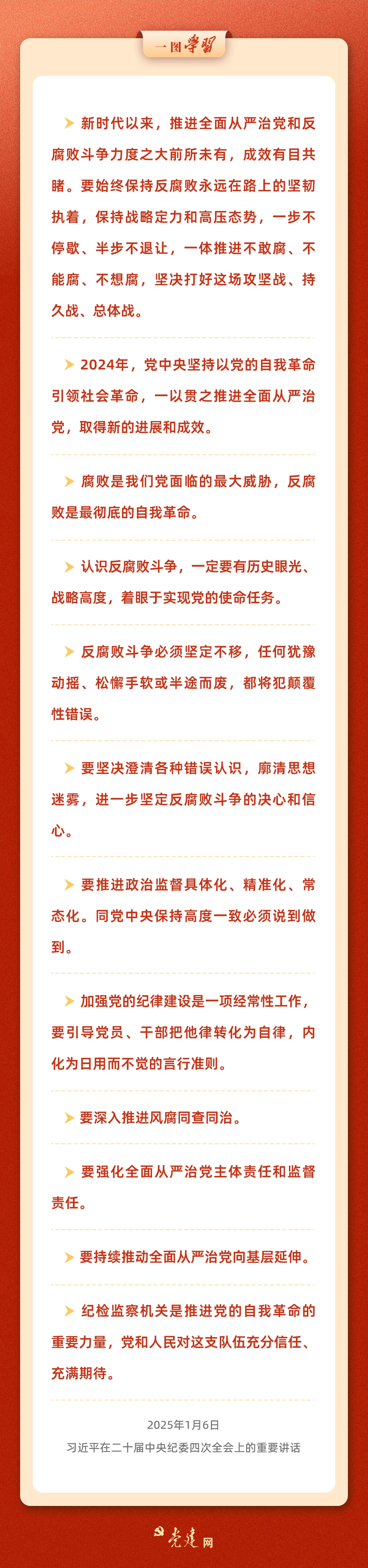 1月6日,習近平總書記在二十屆中央紀委四次全會上發(fā)表重要講話,強調(diào)堅持用改革精神和嚴的標準管黨治黨,堅決打好反腐敗斗爭攻堅戰(zhàn)持久戰(zhàn)總體戰(zhàn)。總書記的重要講話高瞻遠矚、思想深邃、直面問題、振聾發(fā)聵,為深入推進全面從嚴治黨和反腐敗斗爭提供了重要遵循。以下是習近平總書記在二十屆中央紀委四次全會上的重要講話要點梳理,供您學習。
