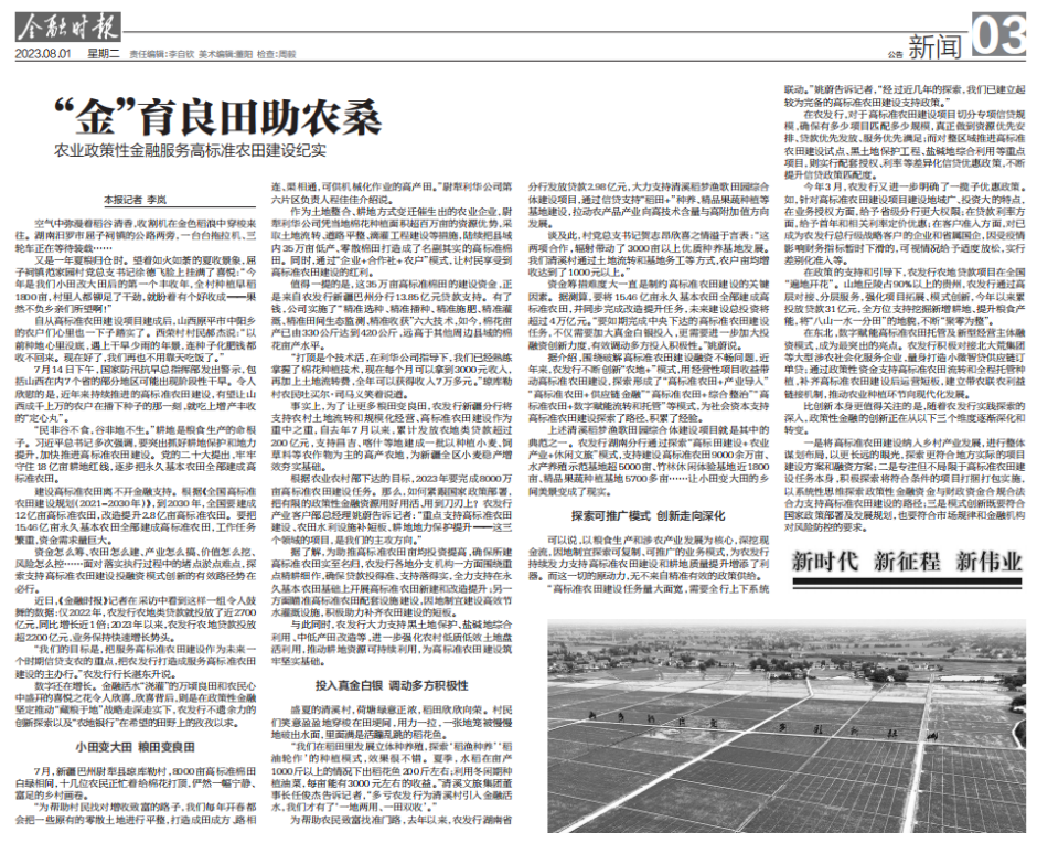 耕地是糧食生產(chǎn)的命根子。習近平總書記多次強調(diào),要突出抓好耕地保護和地力提升,加快推進高標準農(nóng)田建設。黨的二十大提出,牢牢守住18億畝耕地紅線,逐步把永久基本農(nóng)田全部建成高標準農(nóng)田。建設高標準農(nóng)田離不開金融支持。根據(jù)《全國高標準農(nóng)田建設規(guī)劃(2021-2030年)》,到2030年,全國要建成12億畝高標準農(nóng)田,改造提升2.8億畝高標準農(nóng)田。要把15.46億畝永久基本農(nóng)田全部建成高標準農(nóng)田,工作任務繁重,資金需求量巨大。僅2022年,農(nóng)發(fā)行農(nóng)地類貸款就投放了近2700億元,同比增長近1倍;2023年以來,農(nóng)發(fā)行農(nóng)地貸款投放超2200億元,業(yè)務保持快速增長勢頭……在政策性金融活水的“澆灌”下,更多的糧田變良田、收成變收入,而這背后則是在政策性金融堅定推動“藏糧于地”戰(zhàn)略走深走實下,農(nóng)發(fā)行不遺余力的創(chuàng)新探索以及“農(nóng)地銀行”在希望的田野上的孜孜以求。