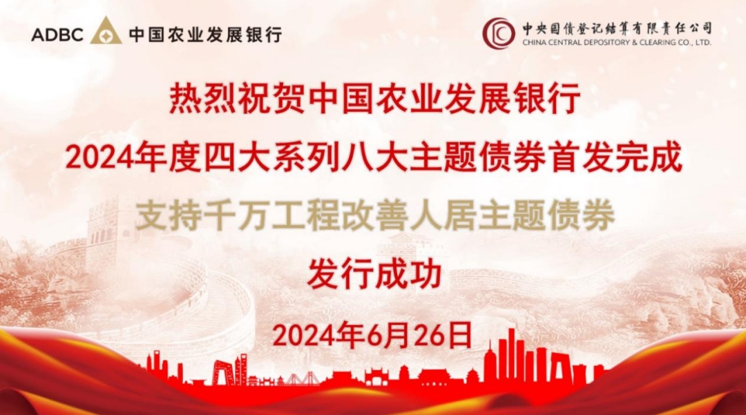 6月26日,中國農(nóng)業(yè)發(fā)展銀行在中央結(jié)算公司以公開招標(biāo)方式,首次發(fā)行10年期支持千萬工程改善人居主題債券160億元,發(fā)行利率為2.3228%,認(rèn)購倍率為2.91倍,獲得了工商銀行、徽商銀行、浦發(fā)銀行、大連銀行、上海銀行等機(jī)構(gòu)的踴躍認(rèn)購。至此,農(nóng)發(fā)行2024年度四大系列八大主題債券首發(fā)工作順利完成。