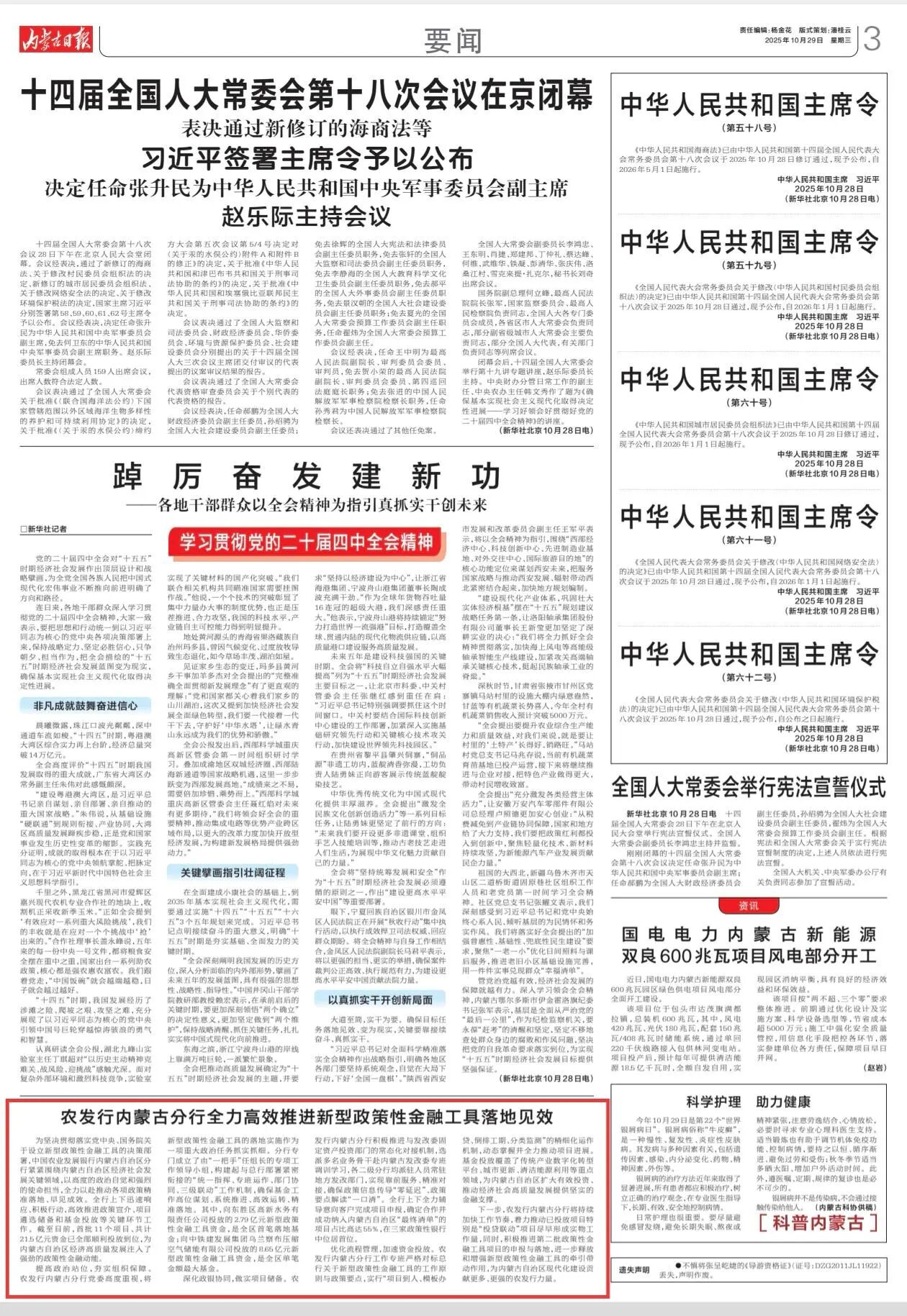 2、內(nèi)蒙古自治區(qū)分行:內(nèi)蒙古日報《農(nóng)發(fā)行內(nèi)蒙古分行全力高效推進新型政策性金融工具落地見效》