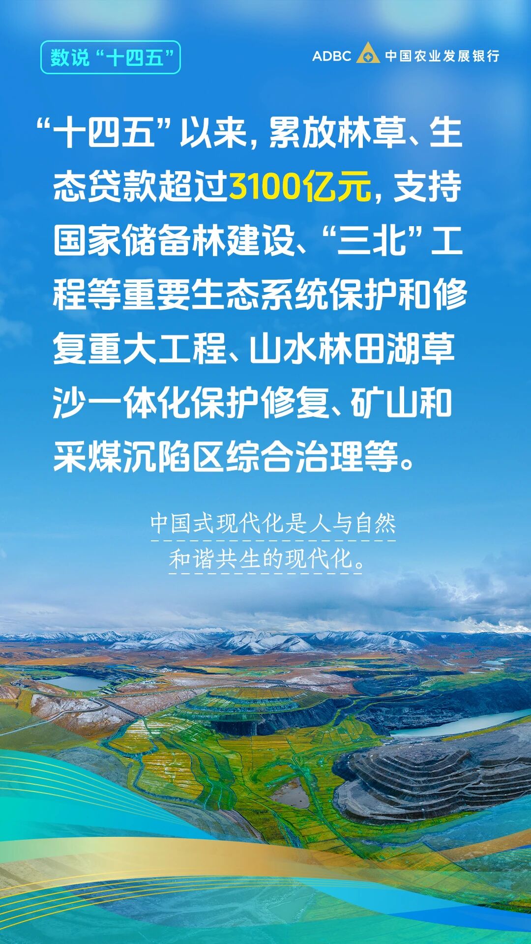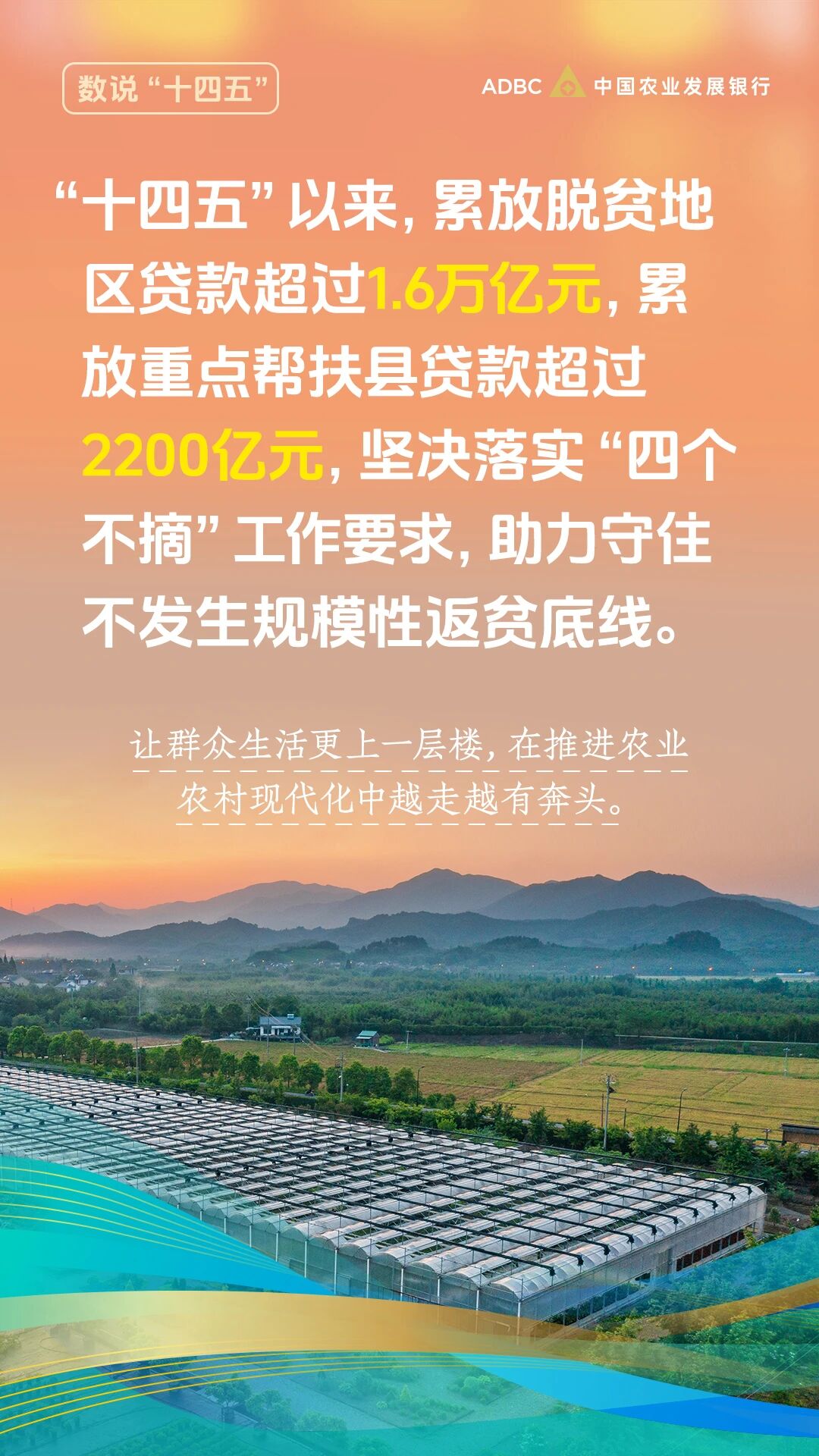 編者按:“十四五”以來,中國農(nóng)業(yè)發(fā)展銀行堅決貫徹落實黨中央、國務院決策部署,持續(xù)完善服務國家戰(zhàn)略的響應機制,堅守農(nóng)業(yè)政策性銀行主責主業(yè),引導支農(nóng)資金投向國家重大戰(zhàn)略、重點領域和薄弱環(huán)節(jié),扎實做好有農(nóng)發(fā)行特色的“五篇大文章”,金融支農(nóng)力度不斷加大,為推進鄉(xiāng)村全面振興作出了積極貢獻。在“十四五”的收官之年,農(nóng)發(fā)行微信公眾號策劃推出“數(shù)說十四五”圖文專題,通過一組組數(shù)據(jù),向您介紹農(nóng)發(fā)行堅定踐行金融工作政治性人民性,全力服務國家戰(zhàn)略和“三農(nóng)”發(fā)展取得的顯著成效。