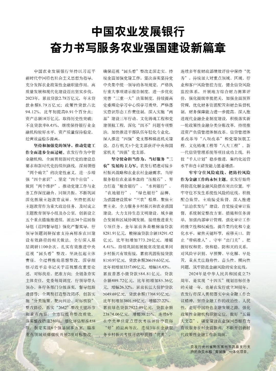 2024年是中華人民共和國成立75周年,是實現(xiàn)“十四五”規(guī)劃目標任務的關鍵一年,也是農發(fā)行成立30周年。農發(fā)行將深入貫徹落實中央金融工作會議精神,堅持金融工作的政治性、人民性,走好中國特色金融發(fā)展之路,強化政策性金融機構職能定位,做好“五篇大文章”,錨定建設農業(yè)強國目標有力有效服務鄉(xiāng)村全面振興,不斷開創(chuàng)新時代政策性金融工作新局面。