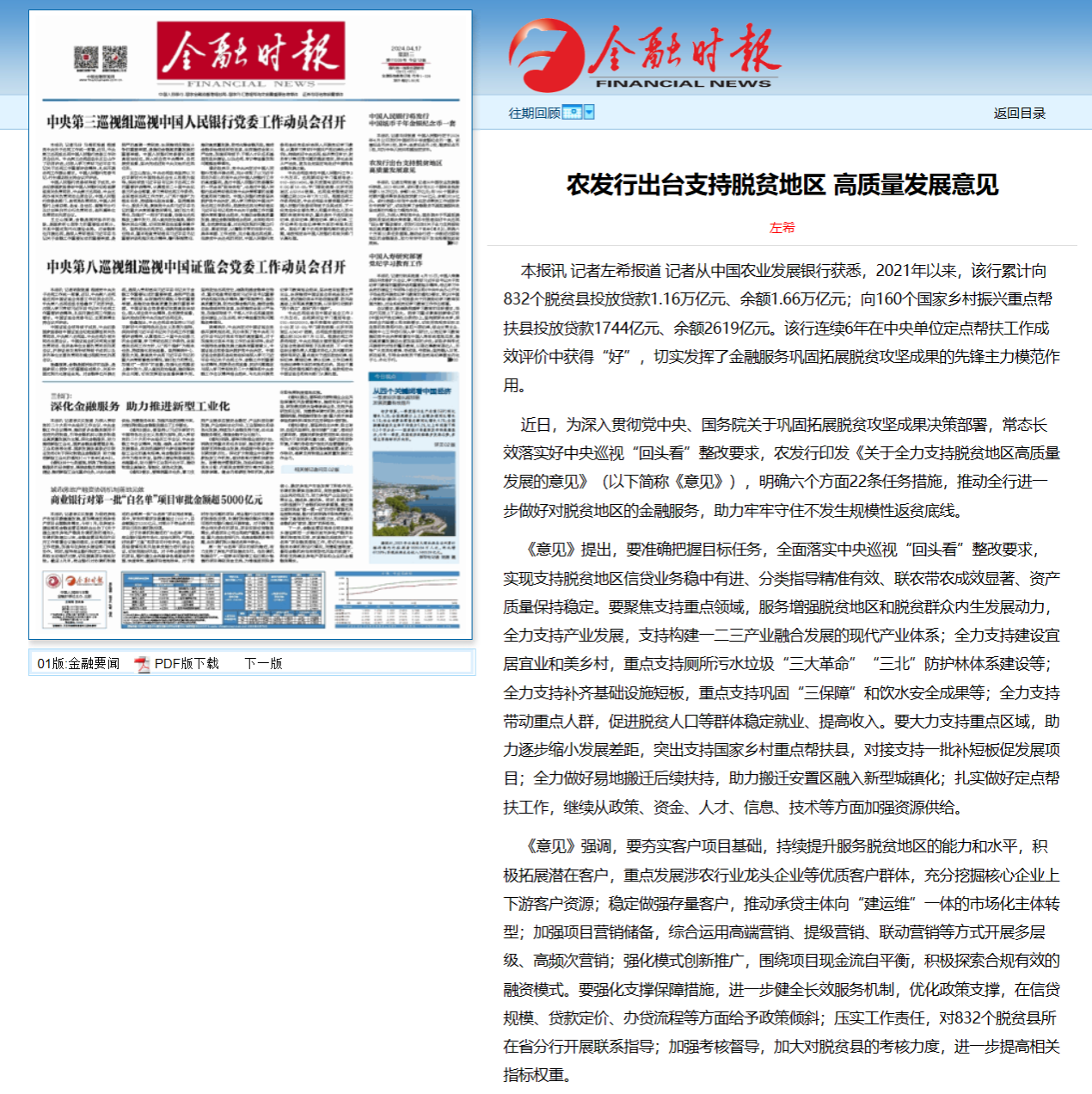 近日,為深入貫徹黨中央、國(guó)務(wù)院關(guān)于鞏固拓展脫貧攻堅(jiān)成果決策部署,常態(tài)長(zhǎng)效落實(shí)好中央巡視“回頭看”整改要求,農(nóng)發(fā)行印發(fā)《關(guān)于全力支持脫貧地區(qū)高質(zhì)量發(fā)展的意見(jiàn)》(以下簡(jiǎn)稱(chēng)《意見(jiàn)》),明確六個(gè)方面22條任務(wù)措施,推動(dòng)全行進(jìn)一步做好對(duì)脫貧地區(qū)的金融服務(wù),助力牢牢守住不發(fā)生規(guī)模性返貧底線(xiàn)。