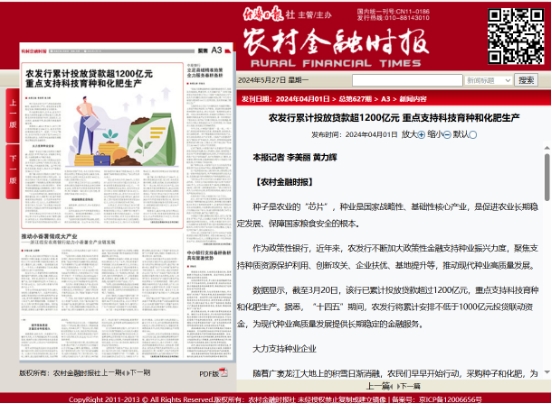 【農(nóng)村金融時(shí)報(bào)】農(nóng)發(fā)行累計(jì)投放貸款超1200億元 重點(diǎn)支持科技育種和化肥生產(chǎn)
