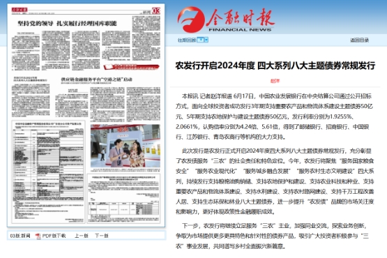 【金融時(shí)報(bào)】農(nóng)發(fā)行開啟2024年度 四大系列八大主題債券常規(guī)發(fā)行