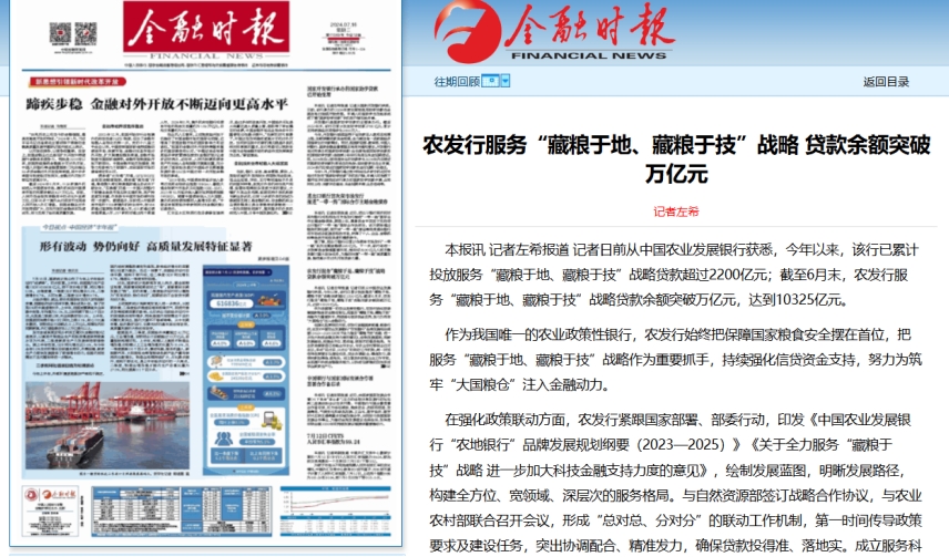 在強(qiáng)化政策聯(lián)動(dòng)方面,農(nóng)發(fā)行緊跟國家部署、部委行動(dòng),印發(fā)《中國農(nóng)業(yè)發(fā)展銀行“農(nóng)地銀行”品牌發(fā)展規(guī)劃綱要(2023—2025)》《關(guān)于全力服務(wù)“藏糧于技”戰(zhàn)略 進(jìn)一步加大科技金融支持力度的意見》,繪制發(fā)展藍(lán)圖,明晰發(fā)展路徑,構(gòu)建全方位、寬領(lǐng)域、深層次的服務(wù)格局。與自然資源部簽訂戰(zhàn)略合作協(xié)議,與農(nóng)業(yè)農(nóng)村部聯(lián)合召開會(huì)議,形成“總對(duì)總、分對(duì)分”的聯(lián)動(dòng)工作機(jī)制,第一時(shí)間傳導(dǎo)政策要求及建設(shè)任務(wù),突出協(xié)調(diào)配合、精準(zhǔn)發(fā)力,確保貸款投得準(zhǔn)、落地實(shí)。成立服務(wù)科技型企業(yè)工作專班,全面提升科技金融服務(wù)能力,以科技創(chuàng)新推動(dòng)加快形成農(nóng)業(yè)新質(zhì)生產(chǎn)力。在強(qiáng)化系統(tǒng)聯(lián)動(dòng)方面,農(nóng)發(fā)行堅(jiān)持從實(shí)踐中來到實(shí)踐中去,深入基層實(shí)踐、傾聽基層聲音,不斷從實(shí)踐中汲取發(fā)展的力量。今年以來,圍繞服務(wù)“藏糧于地、藏糧于技”戰(zhàn)略,該行開展了大范圍調(diào)研活動(dòng),與各級(jí)黨政機(jī)關(guān)、部分承貸主體、新型農(nóng)業(yè)經(jīng)營主體、農(nóng)戶以及信貸業(yè)務(wù)一線員工廣泛座談交流,了解基層需求,真正把問題摸清、把需求找準(zhǔn),上下聯(lián)動(dòng)共謀服務(wù)“藏糧于地、藏糧于技”戰(zhàn)略路徑?!笆奈濉币詠恚r(nóng)發(fā)行緊跟各地加強(qiáng)耕地保護(hù)、農(nóng)業(yè)科技創(chuàng)新的重點(diǎn)及資金需求,培育扶持了隆平高科、墾豐種業(yè)等一批育種聯(lián)合攻關(guān)企業(yè),落地了一批示范項(xiàng)目,支持耕地保護(hù)與質(zhì)量提升面積超6600萬畝。