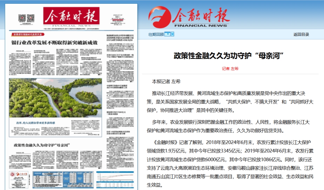 《金融時(shí)報(bào)》記者了解到,2018年至2024年6月末,農(nóng)發(fā)行累計(jì)投放長(zhǎng)江大保護(hù)領(lǐng)域貸款1.9萬億元,其中今年已投放3345億元;2019年至2024年6月末,農(nóng)發(fā)行累計(jì)投放黃河流域生態(tài)保護(hù)貸款6000億元,其中今年已投放1086億元。同時(shí),該行還支持了云南九大高原湖泊生態(tài)環(huán)境治理、安徽馬鞍山薛家洼長(zhǎng)江岸線綜合整治、江蘇南通五山濱江片區(qū)生態(tài)修復(fù)等一批重點(diǎn)項(xiàng)目,取得了顯著的社會(huì)效益、生態(tài)效益和民生效益。