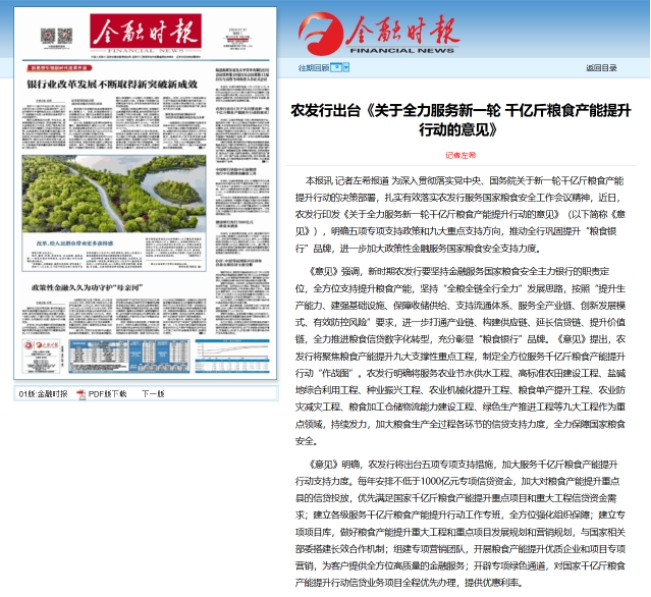 本報訊 記者左希報道 為深入貫徹落實黨中央、國務院關于新一輪千億斤糧食產(chǎn)能提升行動的決策部署,扎實有效落實農(nóng)發(fā)行服務國家糧食安全工作會議精神,近日,農(nóng)發(fā)行印發(fā)《關于全力服務新一輪千億斤糧食產(chǎn)能提升行動的意見》(以下簡稱《意見》),明確五項專項支持政策和九大重點支持方向,推動全行鞏固提升“糧食銀行”品牌,進一步加大政策性金融服務國家糧食安全支持力度。