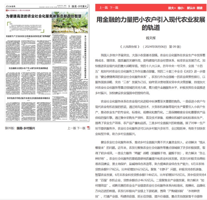 健全農(nóng)業(yè)社會化服務(wù)體系、推動鄉(xiāng)村全面振興離不開大量資金投入,必須解決“錢從哪里來”的問題。近年來,農(nóng)發(fā)行聚焦農(nóng)業(yè)社會化服務(wù)等重點領(lǐng)域做了許多積極探索,取得了初步成效。一是全力服務(wù)“兩藏”戰(zhàn)略(即藏糧于地、藏糧于技),助力解決“怎么種好地”。農(nóng)業(yè)社會化服務(wù)的基礎(chǔ)是耕地質(zhì)量提升和農(nóng)業(yè)科技發(fā)展。農(nóng)發(fā)行積極支持高標準農(nóng)田建設(shè)、黑土地保護、鹽堿地綜合改造等,助力提高農(nóng)業(yè)綜合生產(chǎn)能力,6月末農(nóng)地貸款余額9179億元,比年初增加1623億元。聚焦“卡脖子”問題,積極支持農(nóng)機裝備、智慧農(nóng)業(yè)發(fā)展,6月末農(nóng)業(yè)科技貸款余額1146億元,比年初增加192億元。其中信貸支持4家“百強”農(nóng)機企業(yè),貸款余額合計46.92億元。二是聚焦全產(chǎn)業(yè)鏈發(fā)展,助力解決“如何增效益”。成熟完善的農(nóng)業(yè)全產(chǎn)業(yè)鏈是農(nóng)業(yè)社會化服務(wù)體系向標準化、規(guī)?;⑵放苹较蜻~進的前提。農(nóng)發(fā)行積極向產(chǎn)業(yè)鏈上下游拓展,圍繞“產(chǎn)購儲加銷”“水地種資技”,打通產(chǎn)業(yè)鏈、構(gòu)建供應(yīng)鏈、延長信貸鏈、提升價值鏈,重點支持國家骨干冷鏈物流、農(nóng)村流通重要節(jié)點等現(xiàn)代流通體系建設(shè),推動農(nóng)村一二三產(chǎn)業(yè)融合發(fā)展。截至6月末,全行農(nóng)村流通體系建設(shè)貸款余額2357億元,農(nóng)產(chǎn)品加工業(yè)貸款余額562億元。三是創(chuàng)新金融產(chǎn)品服務(wù),助力解決“誰來種好地”。堅持模式創(chuàng)新和產(chǎn)品創(chuàng)新,為新型農(nóng)業(yè)經(jīng)營主體提供更加適應(yīng)、可得性更強的金融服務(wù)。一方面,堅持融智先行、科技賦能、數(shù)據(jù)支撐,集成運用生物識別、OCR識別、區(qū)塊鏈等金融科技,實現(xiàn)信貸資源精準匹配,投產(chǎn)上線北大荒等高標準農(nóng)田托管種植場景,累放貸款22.7億元,支持黑土地托管面積達139萬畝,有效解決農(nóng)民專業(yè)合作社在生產(chǎn)種植環(huán)節(jié)融資難、融資貴的問題。另一方面,聚焦提升聯(lián)動帶農(nóng)質(zhì)效,持續(xù)開展模式創(chuàng)新,用金融的力量把小農(nóng)戶引入現(xiàn)代農(nóng)業(yè)發(fā)展的軌道。截至6月末,全行新型農(nóng)業(yè)經(jīng)營主體貸款余額3877億元,比年初增加714億元。