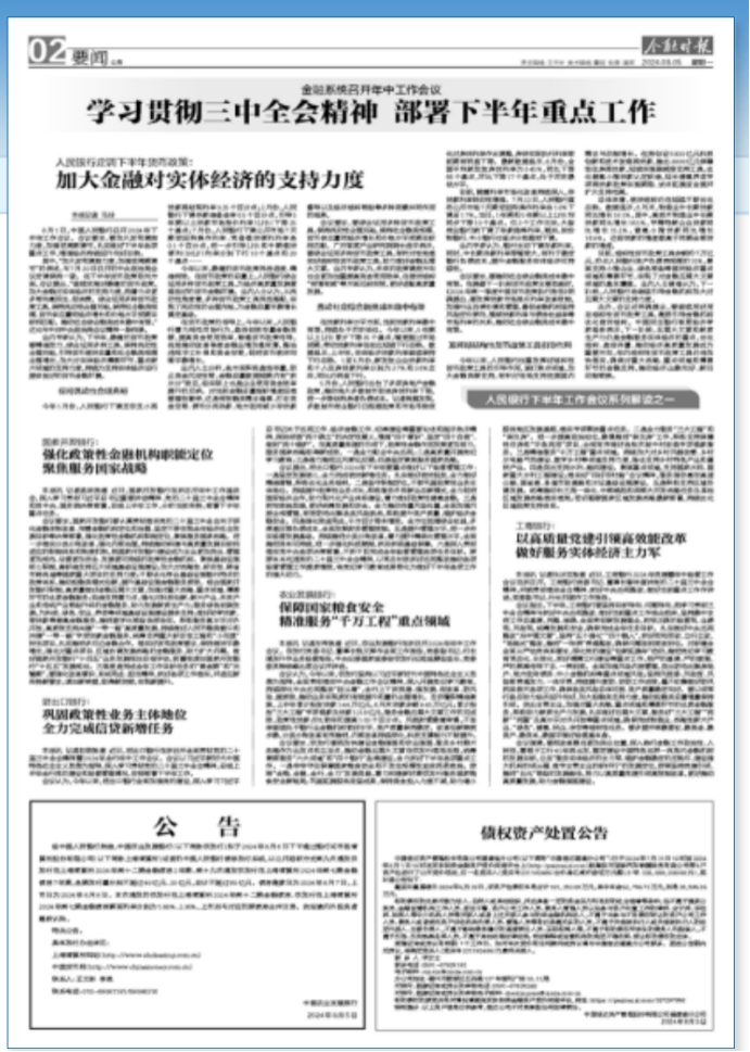 會議要求,農(nóng)發(fā)行要把加快建設(shè)金融強國和農(nóng)業(yè)強國、服務(wù)鄉(xiāng)村振興戰(zhàn)略作為出發(fā)點和立足點,推動金融五篇大文章在農(nóng)發(fā)行落地生根,統(tǒng)籌兼顧服務(wù)“六大領(lǐng)域”和“四個銀行”品牌建設(shè),全力抓好下半年各項重點工作。一是牢牢守住保障國家糧食安全和不發(fā)生規(guī)模性返貧兩條底線。按照“全糧、全鏈、全行、全力”發(fā)展思路,著力構(gòu)建新時期農(nóng)發(fā)行服務(wù)國家糧食安全新格局;鞏固拓展脫貧攻堅成果,保持資金投入力度不減,助力縮小脫貧地區(qū)發(fā)展差距,落實專項幫扶重點任務(wù)。二是全力服務(wù)“三大工程”和“保交房”。進一步提高政治站位,穩(wěn)慎推進“保交房”工作,積極支持保障性住房和“平急兩用”項目,合規(guī)有序做好各批次城中村改造專項借款服務(wù)。三是精準服務(wù)“千萬工程”重點領(lǐng)域。持續(xù)加大對鄉(xiāng)村風(fēng)貌改善、鄉(xiāng)村水電路氣熱建設(shè)、數(shù)字鄉(xiāng)村等領(lǐng)域支持力度,擇優(yōu)支持鄉(xiāng)村特色產(chǎn)業(yè)和富民產(chǎn)業(yè)。四是突出支持水利、路網(wǎng)建設(shè)。聚焦重點領(lǐng)域,支持國家水網(wǎng)、國家重大水利工程建設(shè);落實好“四好農(nóng)村路”會議精神,服務(wù)強農(nóng)惠農(nóng)高速公路、國省道、縣域市政道路和水運基礎(chǔ)設(shè)施建設(shè)。五是積極支持區(qū)域協(xié)調(diào)發(fā)展。統(tǒng)籌推動長三角一體化、中部崛起和西部大開發(fā)戰(zhàn)略任務(wù)及其他區(qū)域發(fā)展戰(zhàn)略落實落地;密切跟蹤國家區(qū)域發(fā)展戰(zhàn)略最新部署,持續(xù)優(yōu)化區(qū)域政策支持體系。