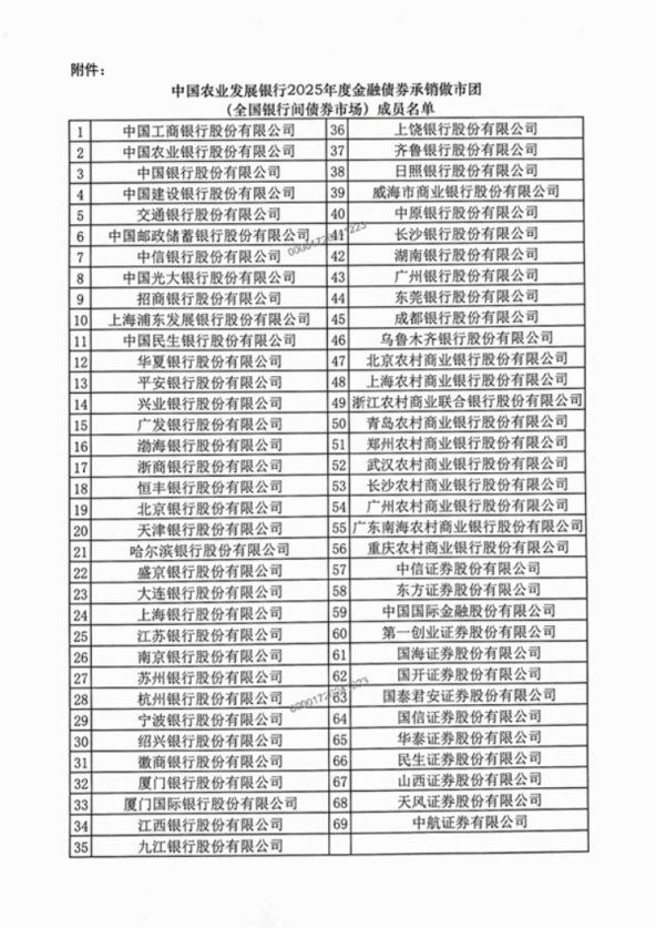 中國農(nóng)業(yè)發(fā)展銀行25日公布2025年度金融債券承銷做市團(全國銀行間債券市場)成員名單,成員共69家。截至2024年末,農(nóng)發(fā)行累計發(fā)債籌資逾18萬億元,年末存量債券規(guī)模超過8萬億元。