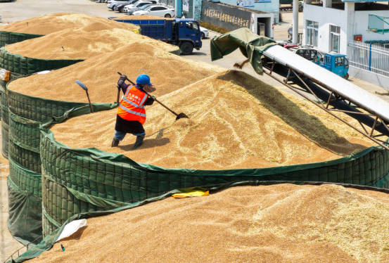 ??位于江蘇盱眙的江蘇農墾三河農場收獲的小麥進入大華種業(yè)三河分公司存儲(5月28日攝,無人機照片)。新華社發(fā)(許昌銀攝)