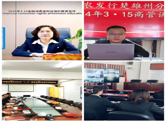 結(jié)合活動(dòng)要求和工作實(shí)際,各級(jí)行圍繞主題,開(kāi)展“金融高管講消?!被顒?dòng)。曲靖市分行通過(guò)視頻宣講方式,面向全行干部職工講解客戶投訴的概念、處理流程等內(nèi)容;玉溪市分行帶頭在全轄2024年“3·15”金融消費(fèi)者權(quán)益保護(hù)教育宣傳活動(dòng)暨金融消費(fèi)者保護(hù)服務(wù)平臺(tái)上線工作部署視頻會(huì)議上做了《提升站位 加強(qiáng)消費(fèi)者權(quán)益保護(hù)工作》的消保宣講;楚雄州分行結(jié)合農(nóng)發(fā)行工作實(shí)際從3個(gè)方面分析講解如何做好金融消保工作;潘家灣支行以《用心守護(hù)金融消費(fèi)者權(quán)益》為主題,用通熟易懂的語(yǔ)言向大眾宣講金融消費(fèi)者享有的八項(xiàng)基本權(quán)利。通過(guò)高管帶頭抓消保、講消保,將消保嵌入經(jīng)營(yíng)管理全流程,形成從業(yè)人員人人參與、人人盡責(zé)的金融消保教育宣傳氛圍。