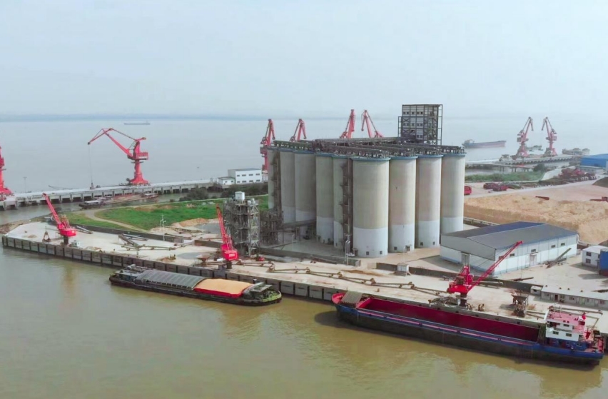▲滿載小麥的貨輪抵達江蘇華穗糧食有限公司糧食專用碼頭