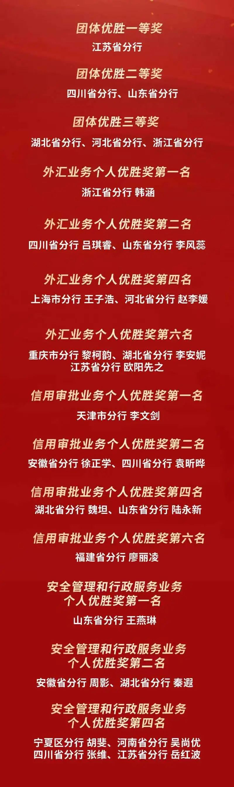 在復賽和決賽現(xiàn)場,由3個專業(yè)條線組成的16個省級分行代表隊沉著應戰(zhàn)、比分你追我趕,將競賽氣氛推向一個又一個高潮,線上線下,1.6萬名職工一起為選手加油助威。經(jīng)過兩場復賽和決賽的激烈角逐,共有6個團體和18名個人脫穎而出。浙江省分行韓涵、天津市分行李文劍、山東省分行王燕琳同時獲頒“中國農(nóng)業(yè)發(fā)展銀行五一勞動獎章”。