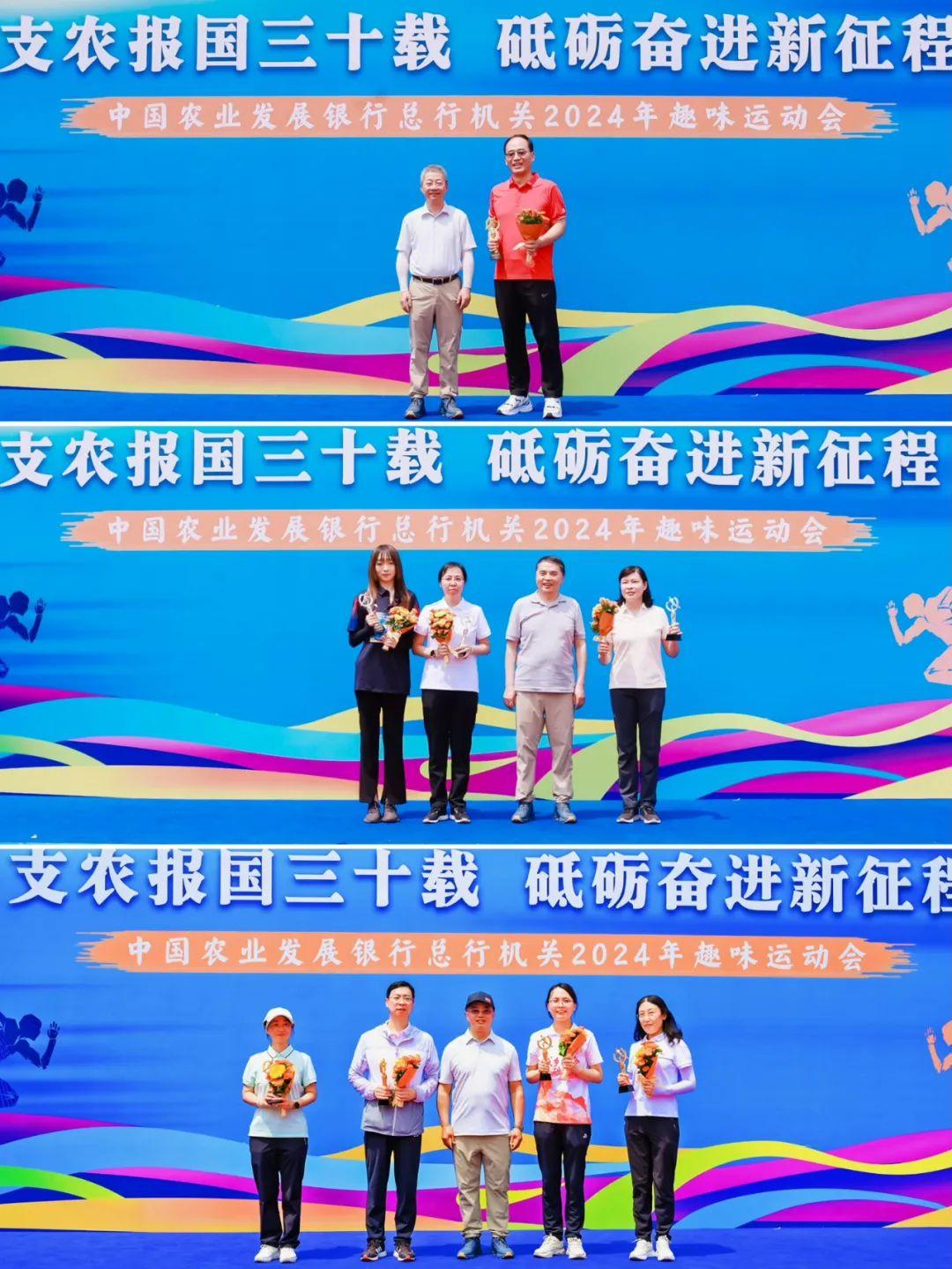 為積極響應(yīng)國家全民健身的號(hào)召,持續(xù)增強(qiáng)廣大職工身體素質(zhì),激勵(lì)廣大職工以昂揚(yáng)向上的精神面貌迎接新中國成立75周年和農(nóng)發(fā)行成立30周年,近日,農(nóng)發(fā)行總行機(jī)關(guān)舉辦“支農(nóng)報(bào)國三十載、砥礪奮進(jìn)新征程”2024年趣味運(yùn)動(dòng)會(huì)。農(nóng)發(fā)行在京行領(lǐng)導(dǎo)全程參加,黨委書記、董事長(zhǎng)錢文揮宣布運(yùn)動(dòng)會(huì)開幕,黨委副書記、副董事長(zhǎng)、行長(zhǎng)湛東升致開幕辭,黨委委員、副行長(zhǎng)、機(jī)關(guān)黨委書記徐一丁主持開幕式。運(yùn)動(dòng)會(huì)共設(shè)置5個(gè)趣味運(yùn)動(dòng)比賽項(xiàng)目,總行機(jī)關(guān)職工按部門編為27支代表隊(duì)參加各比賽項(xiàng)目,經(jīng)過激烈的角逐,總行營業(yè)部等8支代表隊(duì)分別獲得一、二、三等獎(jiǎng),錢文揮、湛東升、徐一丁分別為獲獎(jiǎng)代表隊(duì)頒獎(jiǎng)。